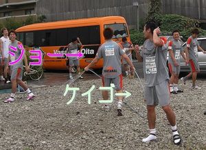 この時カクちゃんは、体育館の中でリュウジに呼び止められ戦術の確認なんかをしていました。