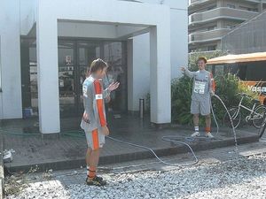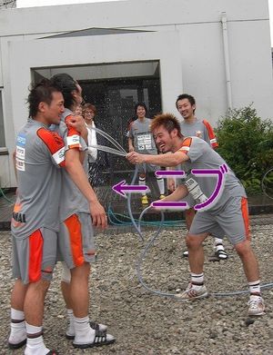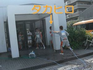 カクちゃんだけではなく、コーラをかけた人たちもコーラで手がベトベトになっていたので、水道からホースを引っ張ってきました。