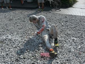 儀式終了後、みんなが体育館の中へ着替えに戻った後もなかなか卵と小麦粉がとれずに体育館の中に入ることすらできない本日の主役、マナブでした